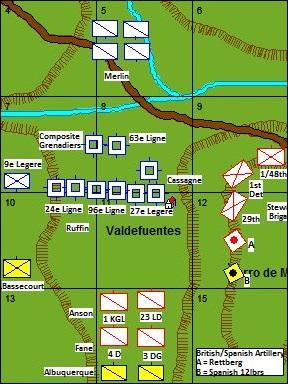 Either way, Anson's brigade began their advance gradually building to the charge with the French infantry able to form their squares in good time, although some accounts say the 27e Legere were surprised and threw their backs against the walls of the farm buildings to avoid destruction. The 1st KGL Hussars aimed for the smaller squares of the 24e and 96e Ligne, whilst the 23rd Light Dragoons headed for the 27e Legere. Braving the fire from French skirmishers to their left on the Sierra de Segurilla and artillery fire from the Cerro de Cascajal, the 23rd Light Dragoons came to grief in an unspotted ravine reported to have been fifteen feet wide and ten feet deep. Those troopers that survived the ravine careered in between the squares of the Legere only to be met by Merlin's cavalry, eventually being repulsed with the loss of 180 men and 222 horses. The 1st KGL Hussars also went into the ravine although it was reported shallower in their area. They attacked the 24e Ligne but, realising the poor situation, did not press it and retired in relatively good order with casualties of 37 troopers for the day's battle.