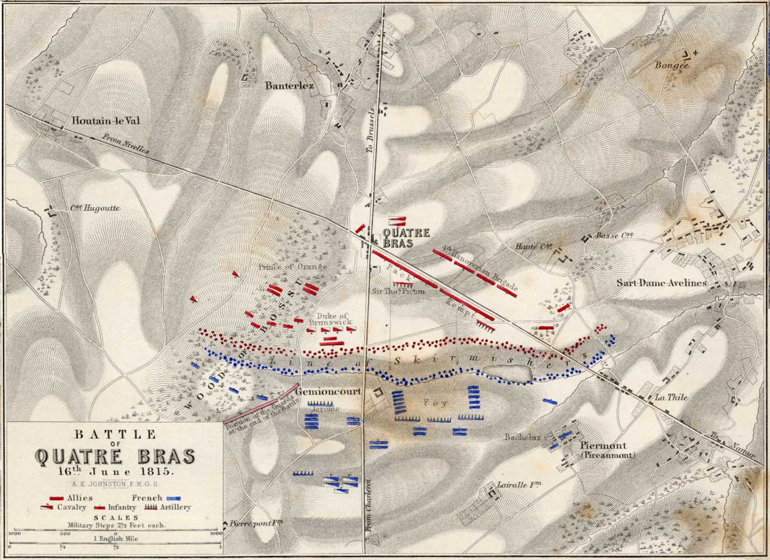 Under Wellington's personal direction the British brigades now lined the Namur road to the east of the crossroads, with the 95th Rifles placed in the woods opposite Lac Materne where they brought their well directed fire to bear on Bachlu's voltigeurs, The 92nd Highlanders were detailed to hold the buildings at the crossroads thus anchoring the right of the British line; and, with the arrival of the Duke of Brunswick's 4,000 men, Wellington was able to stabilise the Dutch to the right of the crossroads. Thus the allies now had 21,000 men against Ney's 25,000 as the struggle for possession of Quatre Bras continued to escalate.