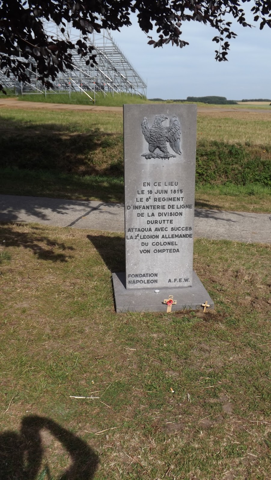 The monument records that the 8e Ligne part of Durette's division that had been on the French extreme right flank near Papelotte had been brought into the centre by Ney following the fall of La Haye Sainte and was involved in the combat with the 5th KGL; bravely led forward by Colonel Ompteda who, as he predicted, was ridden down with most of his men by cuirassiers after driving the French infantry back.