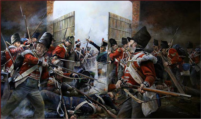 | Closing the North Gate by Chris Collingwood, Colonels Macdonell and Wyndham can be seen leading the effort to bar the gates as the 1e Legere attempt to develop the breach. |