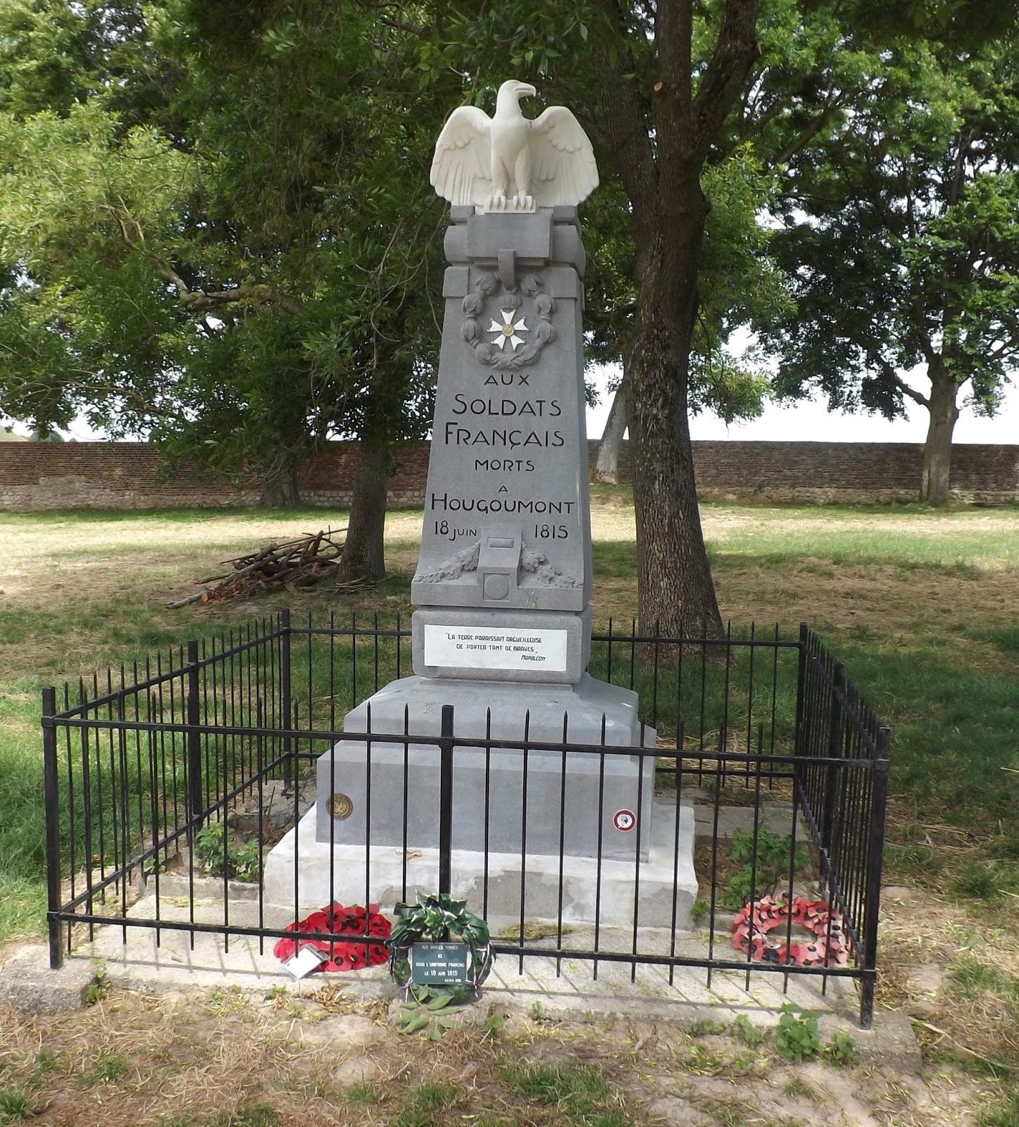 At the far end of the garden is a monument erected in 1913 to the French soldiers killed at Hougomont. The Eagle was originally bronze but was stolen by German troops in WWI.