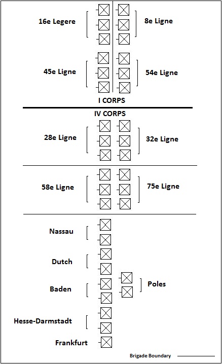 Laplanne's brigade (16e Legere and 45e Ligne) was arrayed in battalion columns but with the columns having just six paces (about 4.5 yards) between them, suggesting no intention to deploy into line. The following battalions of Solignac's brigade (8e and 54e Ligne) were described as formed in battalion mass or close order columns and deployed as such to allow them to move up quickly to exploit any breakthrough gained by the front line.