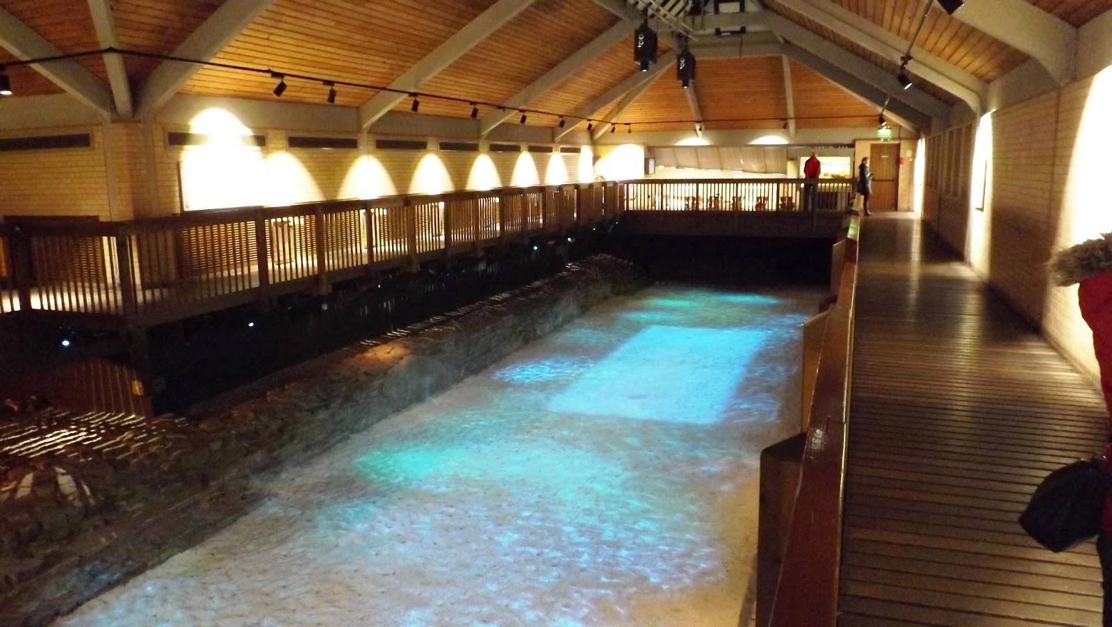Alongside the open air bath the excavation reveals part of the frigidarium or cold bath hall with the plunge pools and ornate drain covers set off against skilfully placed silken drapes showing where the windows, walls and columns would have stood and giving an impression of the building's shape and appearance.