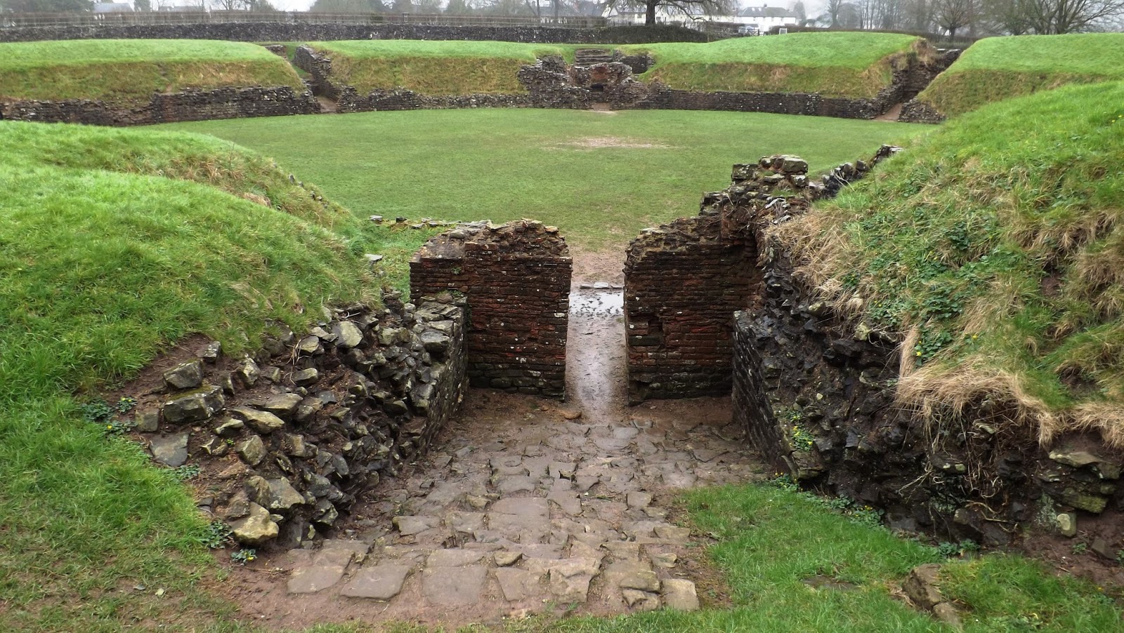 | A drain runs under the centre of the arena through the south gate, centre top, that still carries water out and down to the River Usk to this day. |