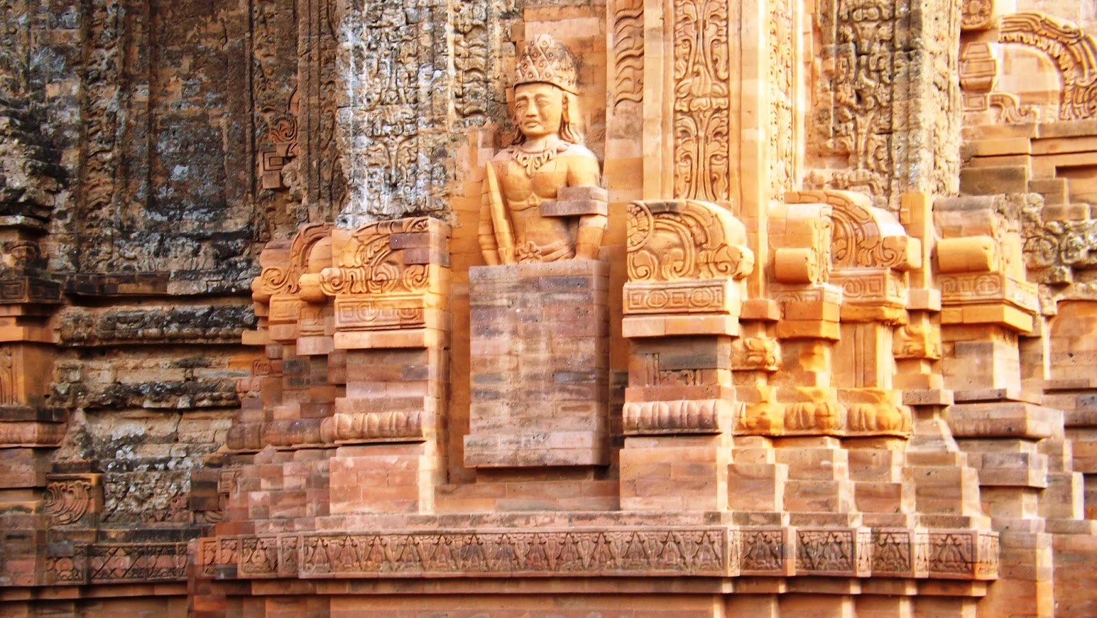 To day the monuments to this great Vietnamese civilisation are these dramatic red brick towers that dominate the landscape adorned with a splendid array of carvings and intricate pattern work