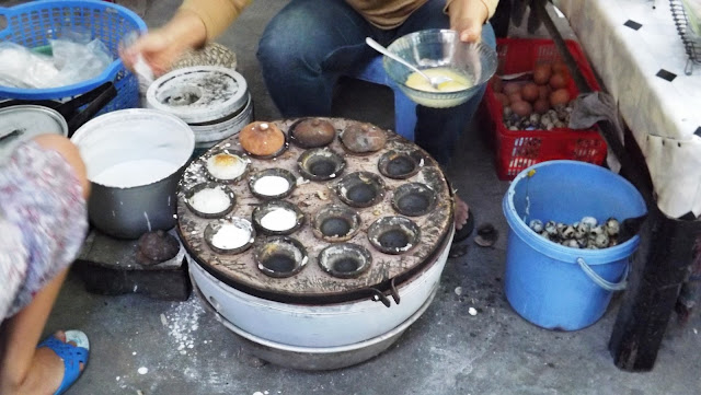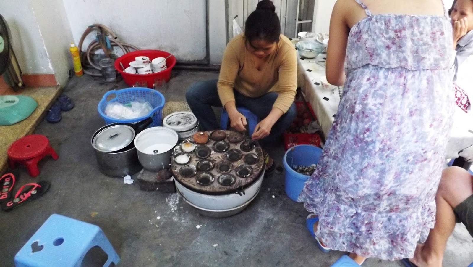 The last dish of egg and rice cakes again featured a white rice batter seen in the metal pan that the lady is ladling the mixture from into the little wooden poaching pots that sit on a bowl of hot charcoal cooking the mixture from below with a pot cover on each to keep in the heat.