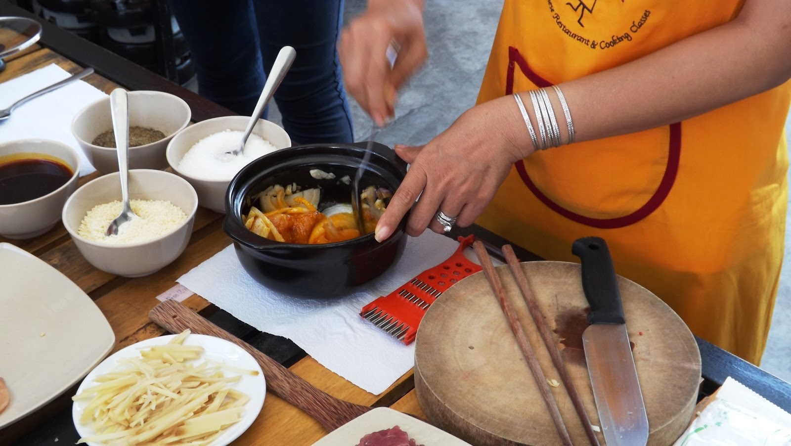 Once we had all we needed we grabbed a mini-bus back to the restaurant to start our cooking lesson where we were able to watch the various ingredients being prepared and put together, before following the process ourselves.