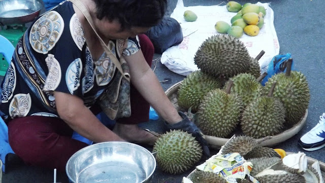 The Durian, "Marmite" fruit of fruits gets checked for its quality pre-purchase in the street market