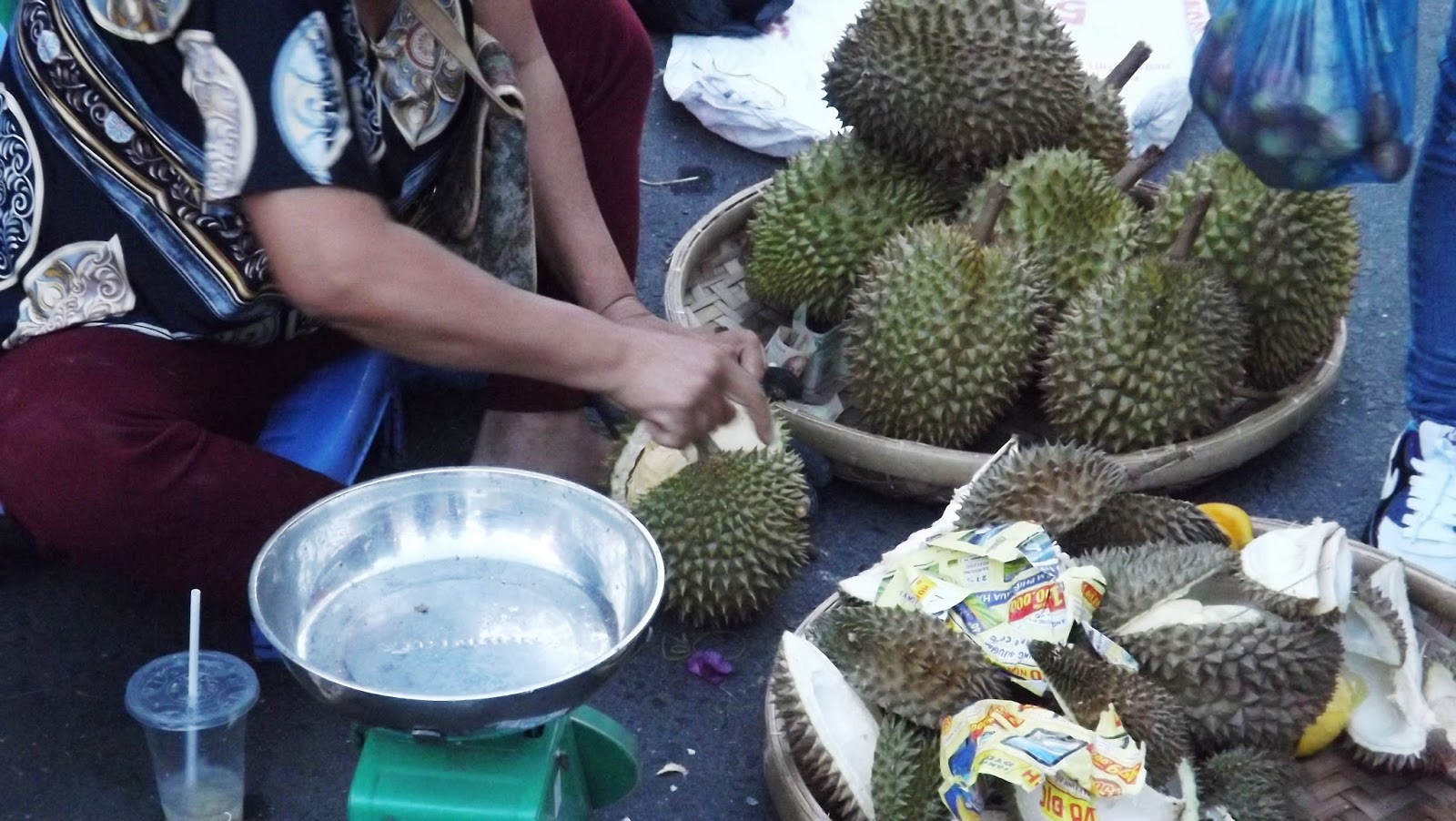 | The Durian, "Marmite" fruit of fruits gets checked for its quality pre-purchase in the street market |