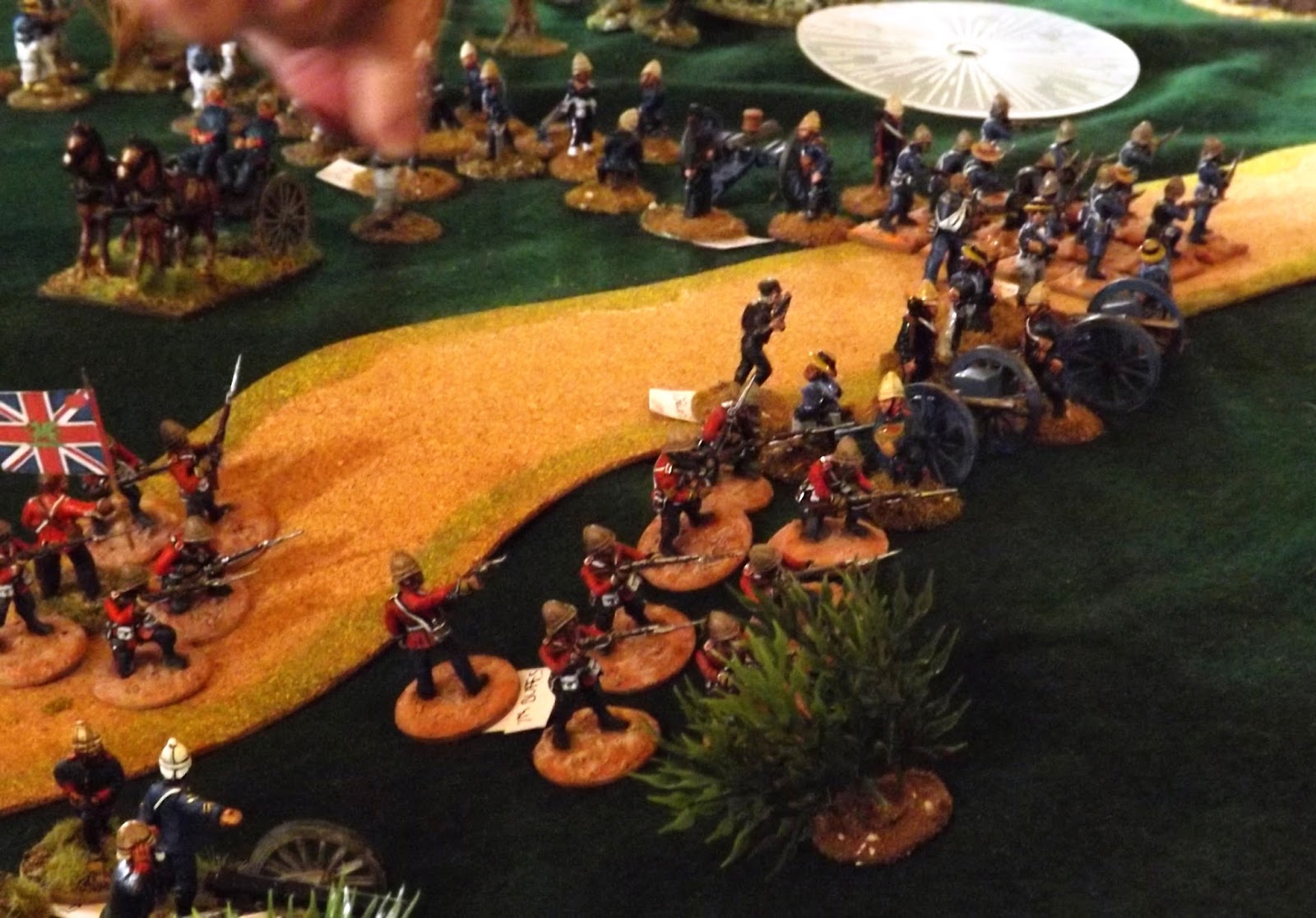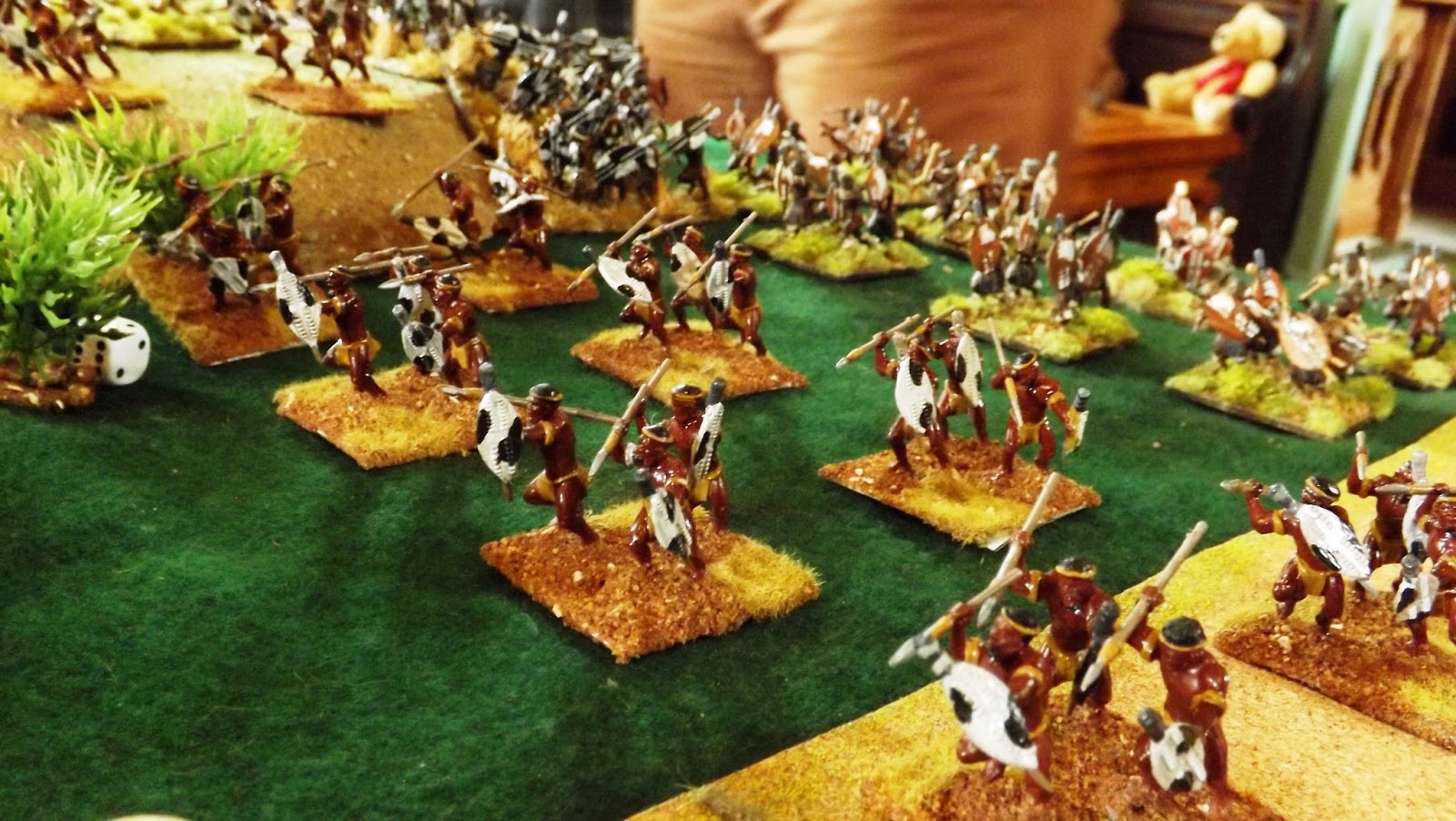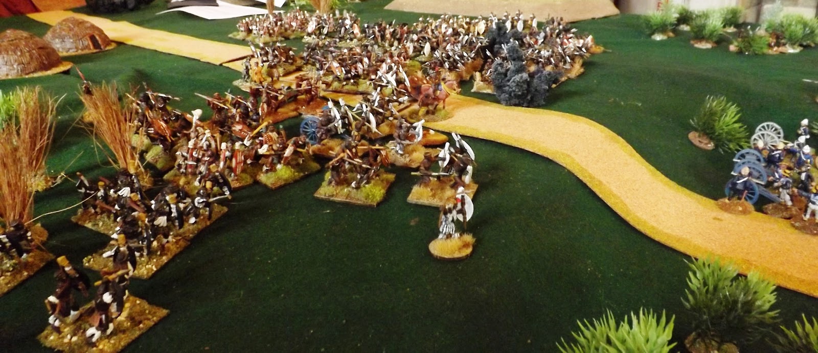 This set up allowed the Zulu "horns, head and loins" battle formations to manoeuvre off table, moving twice as fast as on table to allow them to position themselves the more favourably when they chose to enter the table or when they were forced to by the sight of their burning village exciting the younger less controllable warriors to attack, as was the case in reality.