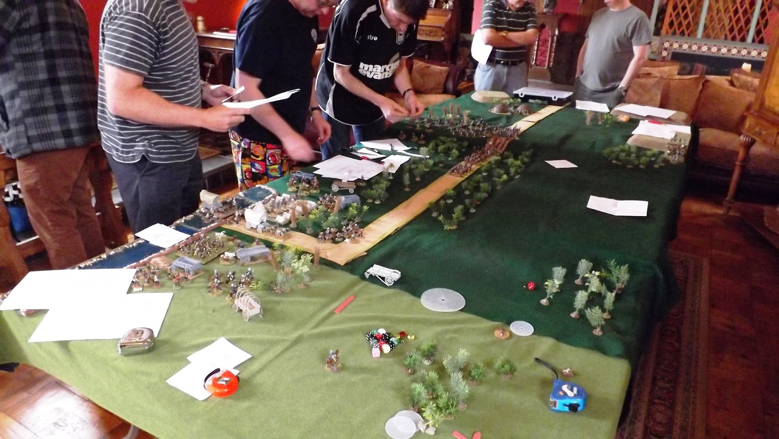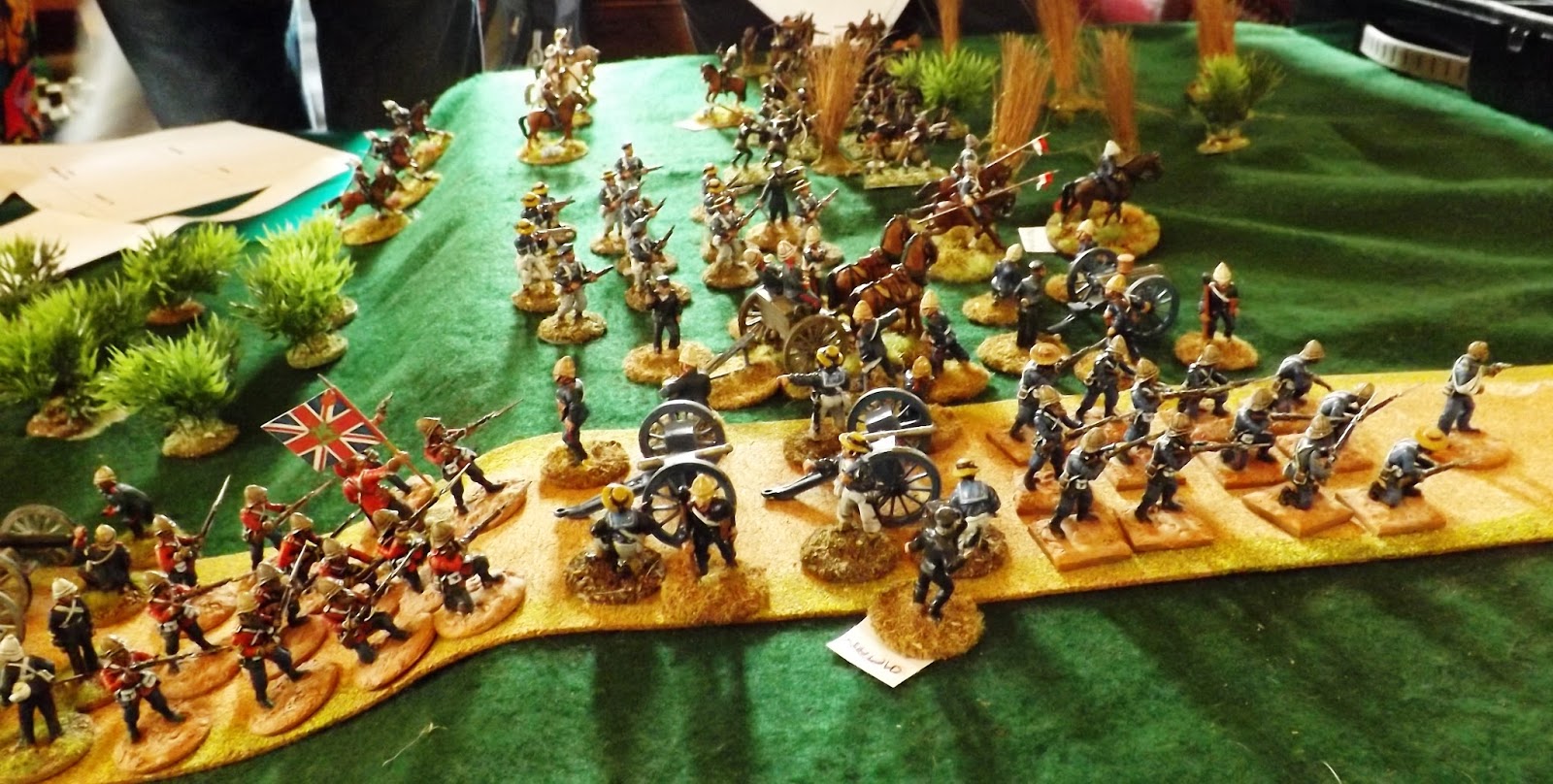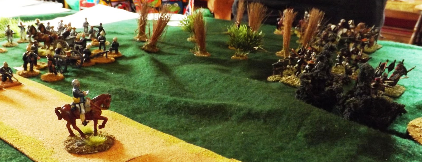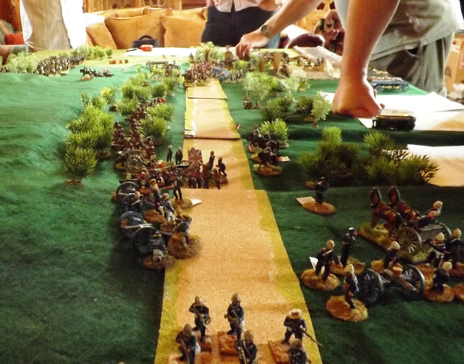 This set up allowed the Zulu "horns, head and loins" battle formations to manoeuvre off table, moving twice as fast as on table to allow them to position themselves the more favourably when they chose to enter the table or when they were forced to by the sight of their burning village exciting the younger less controllable warriors to attack, as was the case in reality.