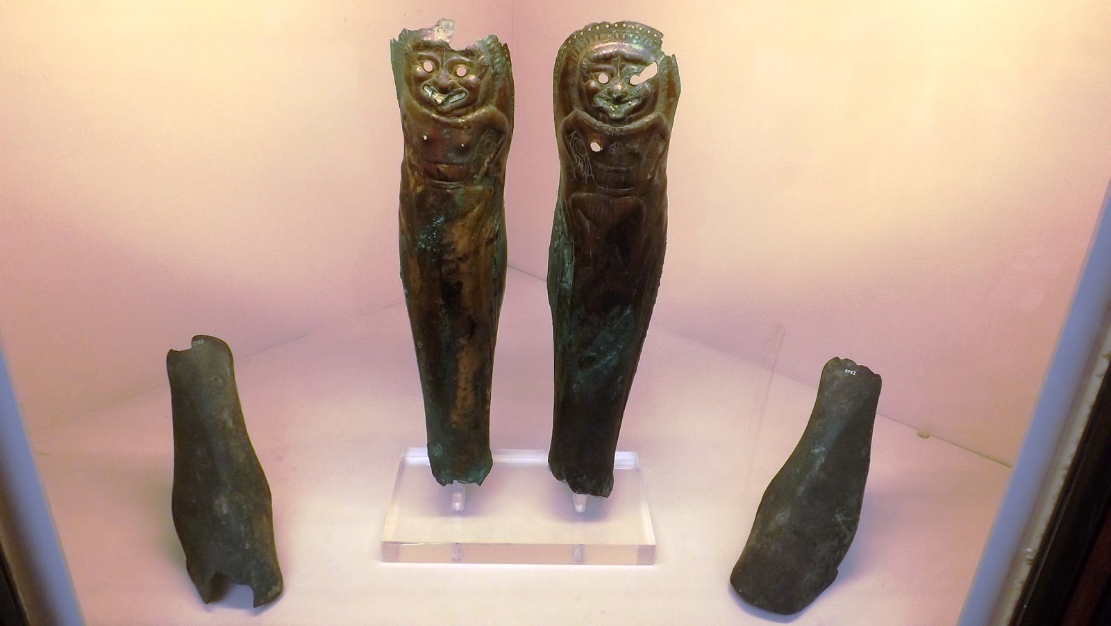 | The cavalryman ankle guards are from Apulia and the bronze greaves with Gorgons mouths have traces of inlaid bone in the mouth and were made in Southern Italy 550-500 BC. |