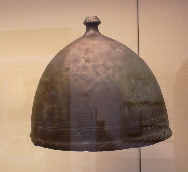 | Bronze pot helmet 600 BC, found near Ancona. Type used in Picenum, Umbria and Etruria. The knobs were designed to deflect blows and the helmet would have carried a crest |