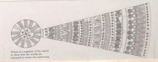 The illustration below shows the detail of the pattern on the shield see above. Alongside the shield can be seen n Etruscan bronze trumpet dating 400-200 BC and a pair of bronze greaves from southern Italy 500-450 BC.
