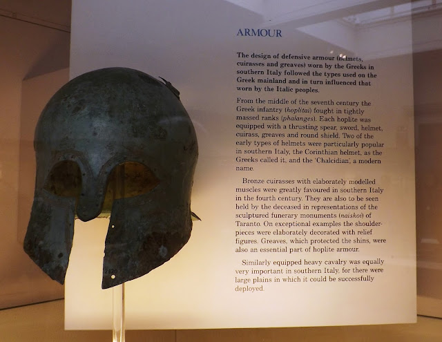 In the picture below alongside the bronze muscled cuirass from Southern Italy 375-325 BC can be seen a very ornate bronze helmet with horse headed sea monsters, thought to be Messapian dating from 325-275 BC together with the Apulo Corinthian type shown in the header to this post.