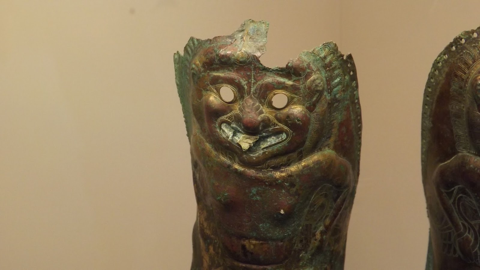 | The Gorgons mouth with inlaid bone as teeth on these bronze greaves |