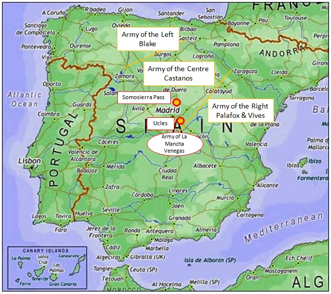 Following the defeat of the Vanguard Division of the Army of the Centre in January 1809 at the Battle of Ucles, commanded by General Venegas, Infantado was relieved of command and General Venegas assumed command of the newly formed Army of La Mancha that continued to be a threat to the southern approaches to Madrid going into the summer of 1809 leading up to the Talavera campaign.