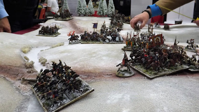 As announced in the preceding Wargaming media, Gripping Beast were rolling out their new set of ancient/medieval rules 'Swordpoint', demonstrating the game with a nice little display of Teutonic Knights going at in a suitably snowy set up.