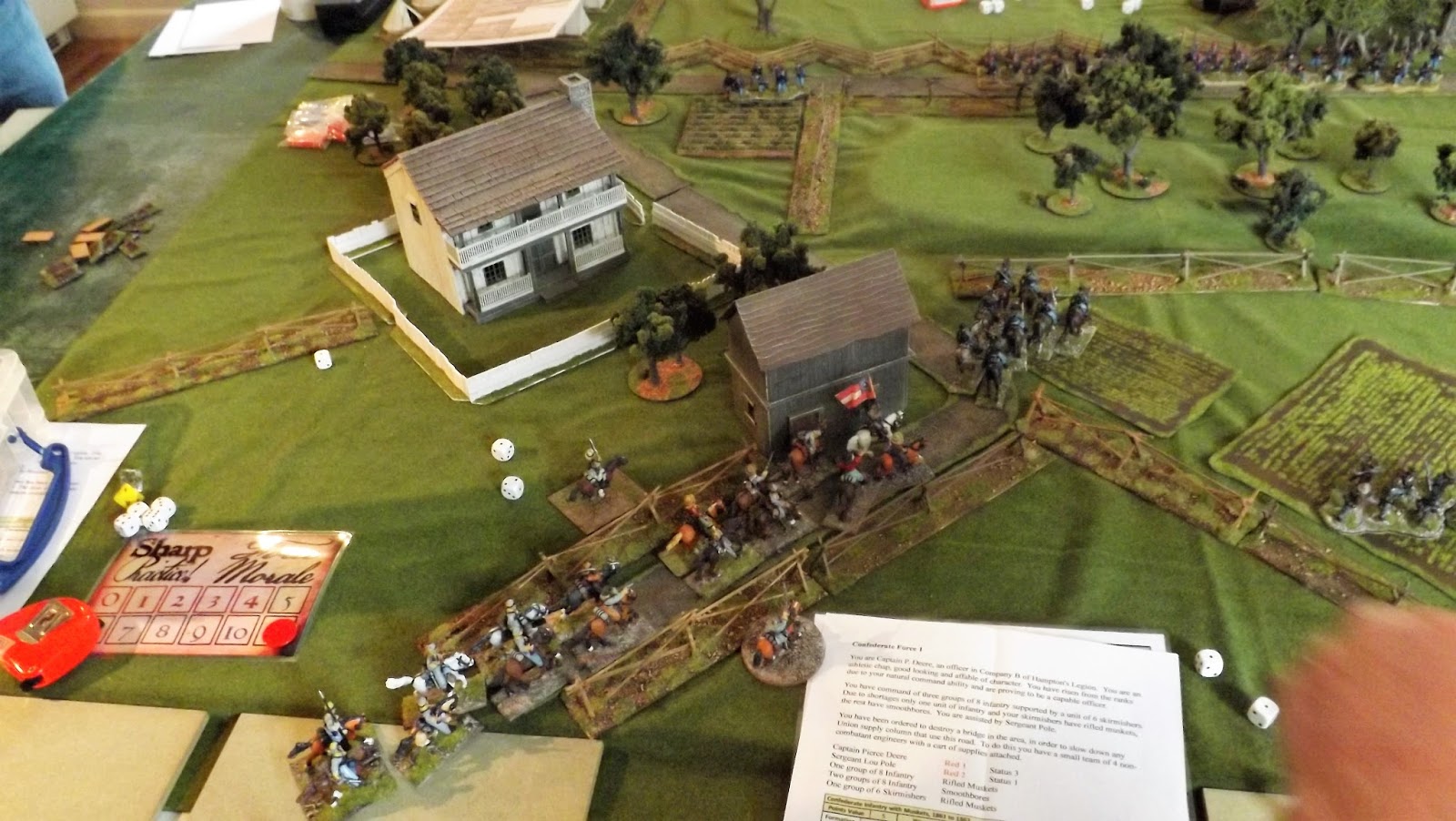 Back to the table and suddenly it was looking like a bad day at the Union Office as Confederate infantry swept forward on to the Union ridge and around Prickly Ball House, supported by their cavalry that had managed to cross the river using a bridge that needed to be blown up by the Confederate infantry getting their support.