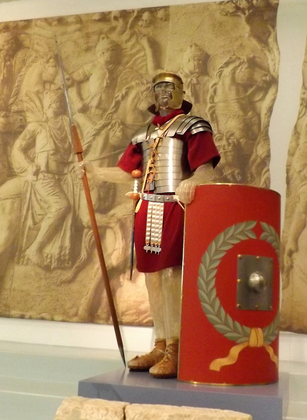 Finally, the copy of a fragment of a tombstone, seen above, found in Rome is 2nd century. In the third line down can be seen the reference to ULPIA NOVIAMAGUS, the Roman name for Nijmegen. The tombstone was made for the grave of a chap called Aurelius who served in the Emperor's bodyguard.