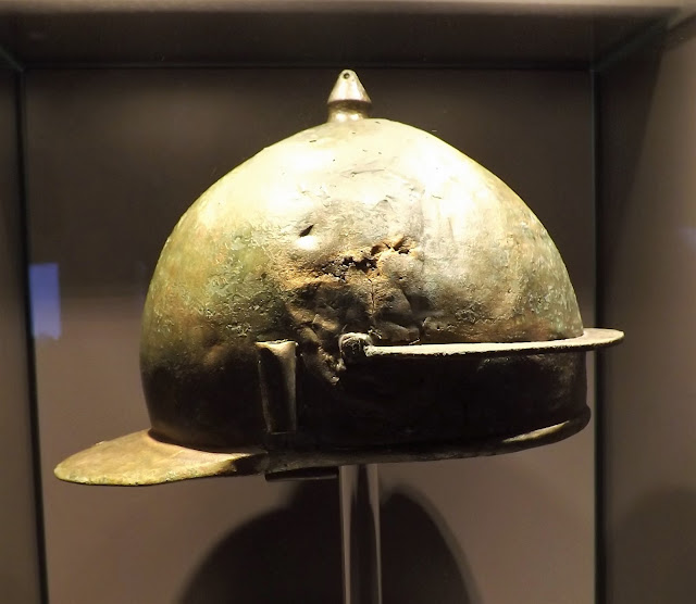 Xanten can't boast the collection of masked cavalry helmets seen at Nijmegan but has a similar example with the remains of the horse hair platting seen in the replica alongside it.