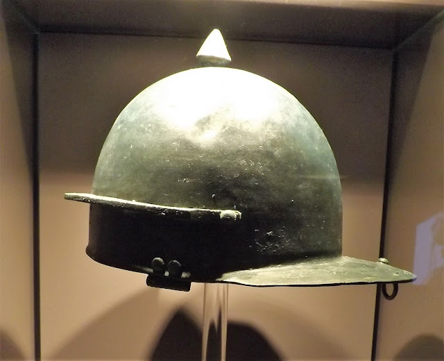As mentioned, the first Roman incursion was military under Julius Caesar, and with the establishment of a major forward operating base that in time developed into a major fortress it is therefore not surprising to see an impressive collection of military exhibits; including an impressive collection of Roman coolus type helmets showing that transition to the Imperial Gallic style as shown in the similar collection held at Nijmegan with the additions of wider cheek, neck and ear guards together with the reinforcing peak with the last example showing the improved slope added to the large neck guard.