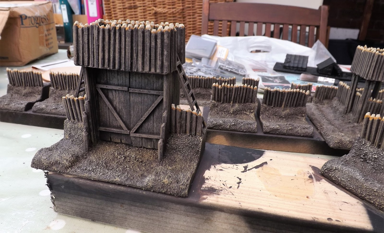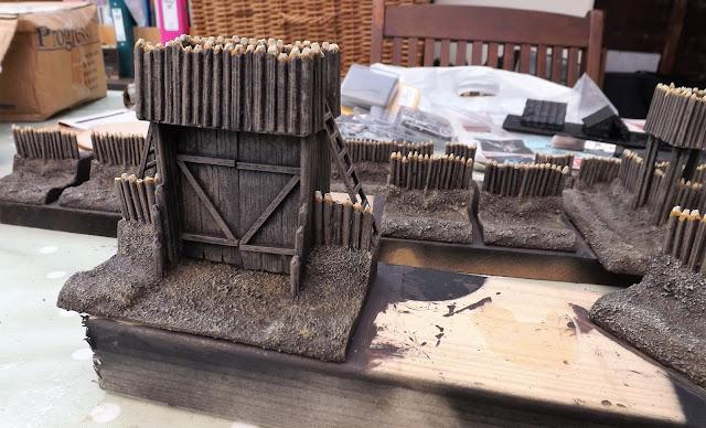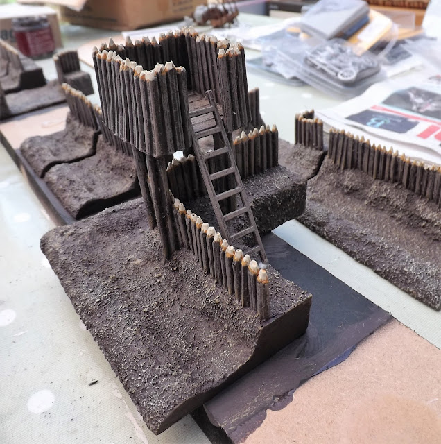 The groundwork was drybrushed with Citadel Tallarn Sand and highlighted with Deco Art Sandstone Grey and once I have varnished the thing will get some touching up with static grass and some tufts to enable it to blend onto the table and to suggest an embanked wall of layered turf on which the fence posts have been added.