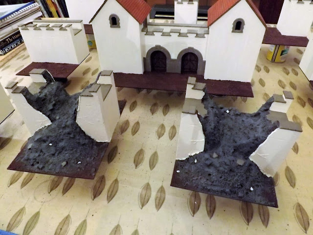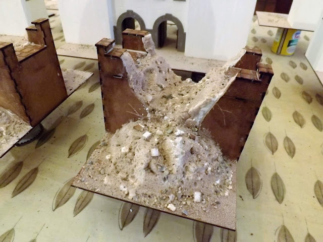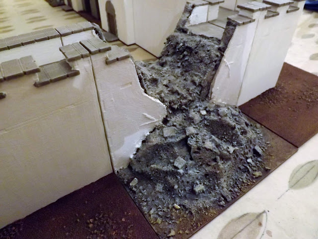 One other touch that I didn't mention in part one was that I carefully scored crack lines into the MDF around the breached areas implying the stress to the remaining sections of plaster work still standing.