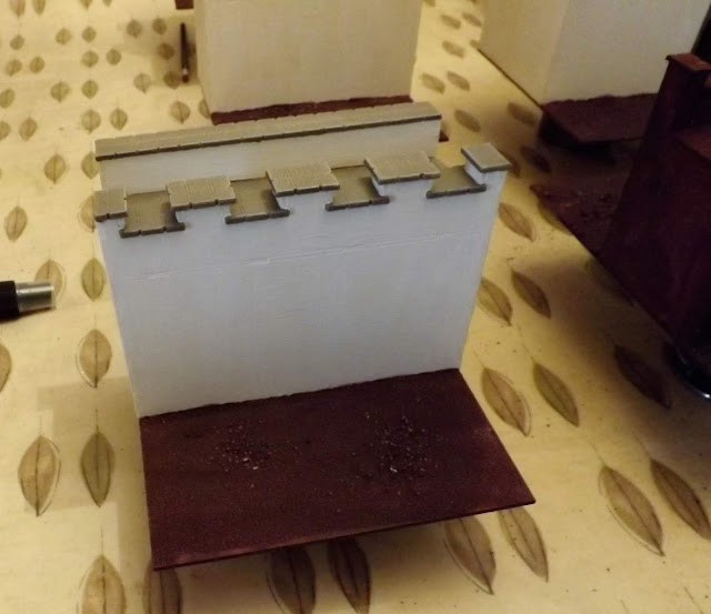 | The base I planned for my gate house did not allow for the steps projecting from the back of the two towers and so I added left over wall capping to make a new layer of paving to go under each step |
