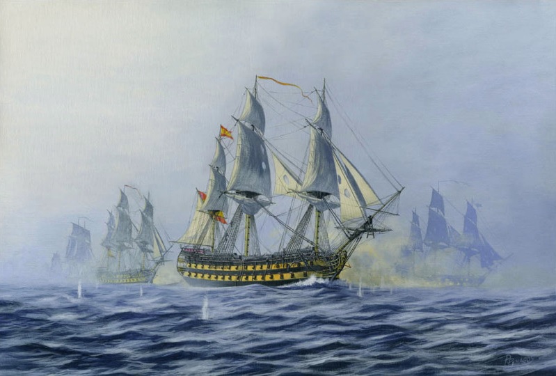 | Finisterre - Carlos Parrilla Penagos https://www.carlosparrillapenagos.es/pintura-naval/ The 80-gun Argonauta, flying the pennant of Admiral Gravina at her mizzen, and leading the van of the Combined Fleet, exchanges broadsides with HMS Hero in the van of Vice Admiral Sir Robert Calder's squadron during the Battle of Cape Finisterre 22nd July 1805 |