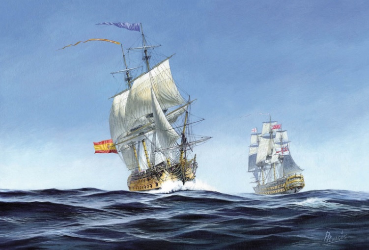 | 'Back Found' - Carlos Parilla Penagos https://www.carlosparrillapenagos.es/pintura-naval/ A Spanish 64 shows her guns, passing a British 74 on the opposite tack |