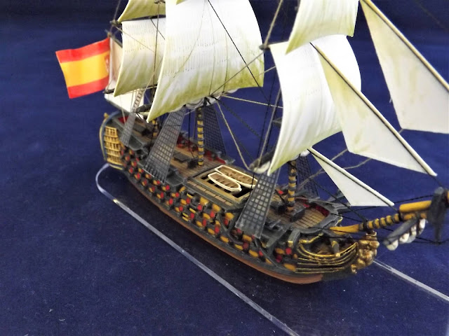 The last Spanish ship needed to complete the forty ships of the Franco-Spanish Combined fleet was a three decker designed to fill the requirement of the Spanish 100-gun Rayo or 'Lightning' which began her career as an 80-gun 3rd rate ship in 1749, making her, with her fifty-six years of service, the oldest ship to take part in the Battle of Trafalgar, but also with her later refit in 1803 to having a third upper deck built, allowing her to carry 100 guns but leaving her, with her original two gallery stern quarters, as a bit of an anomaly and not your usual looking Spanish first rate.