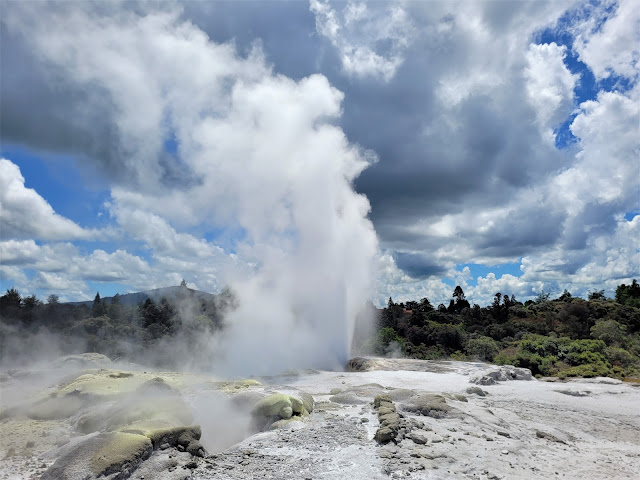 | The Pohutu Geyser in the Te Whakarewarewa Valley puts on a display during our visit to the Te Puia Maori Arts & Crafts Institute in Rotorua. https://www.tepuia.com/about-us/ |