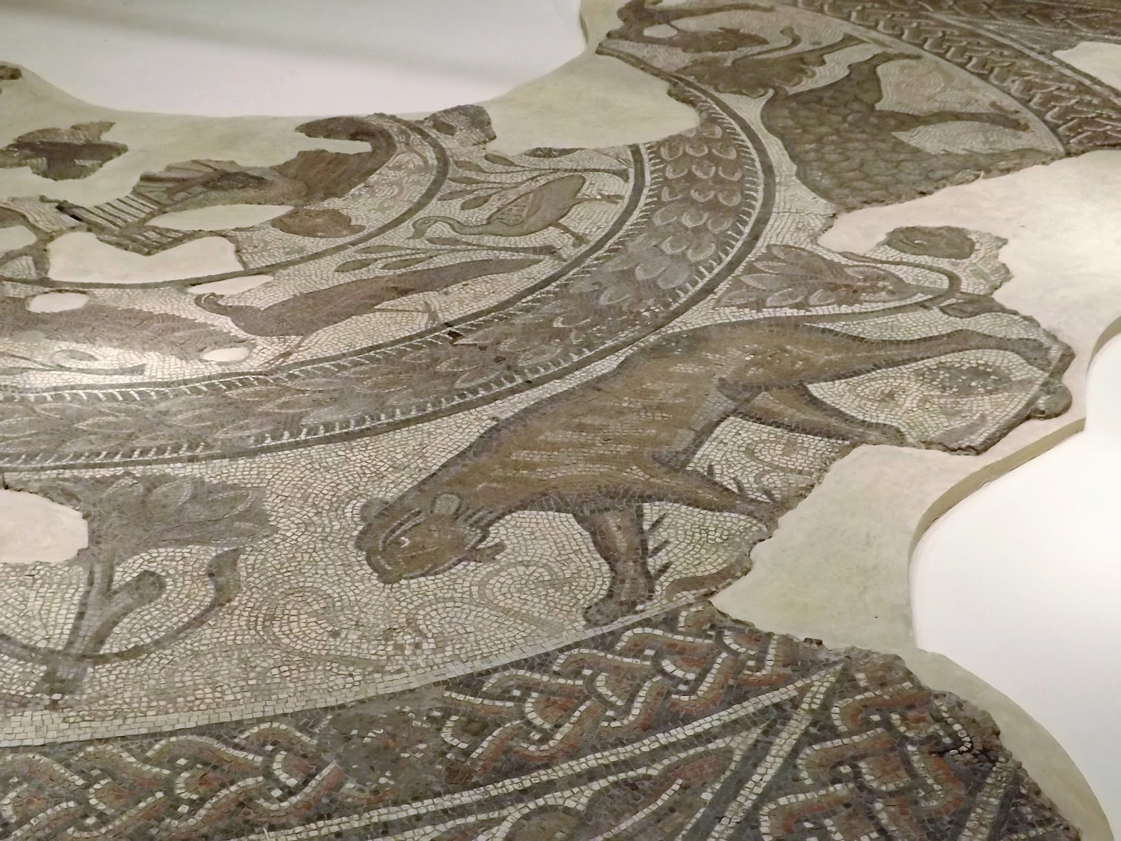 The hare motif is a unique centrepiece in Britain and the mosaicist has used tiny pieces of green glass to emphasise the curved back of the animal.