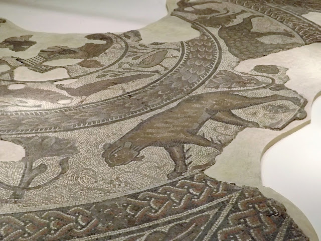 Dating from the 4th century AD, the mosaic shows Orpheus in the centre piece with a voluminous cloak playing the lyre and charming the animals with his music, relating to the Greek myth that said he could play the lyre so beautifully that wild beasts were instantly tamed.
