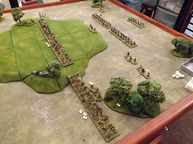 With Beacon hill being the key feature of this battle and that the Vikings charged up it in spite of its commanding position I simply put out my new modular hill terrain as seen, sprinkled a limited amount of terrain in the form of the odd set of open woods, small copses and sorted out two armies to fight the standard 'Annals Battle' scenario which is basically a line em up, go at it affair.