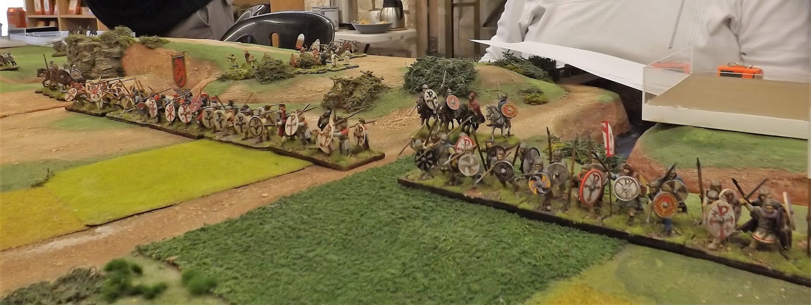 | Both armies arranged for battle with Steve's Viking force arranged in three distinct groups on the left of picture |