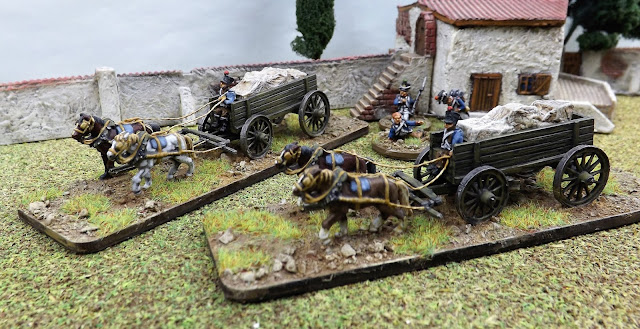 I couldn't resist working on a pack of these models whilst doing the limber teams and soon discovered the need to get my scratch building head on to organise horse teams and drivers for this pair of French supply wagons.