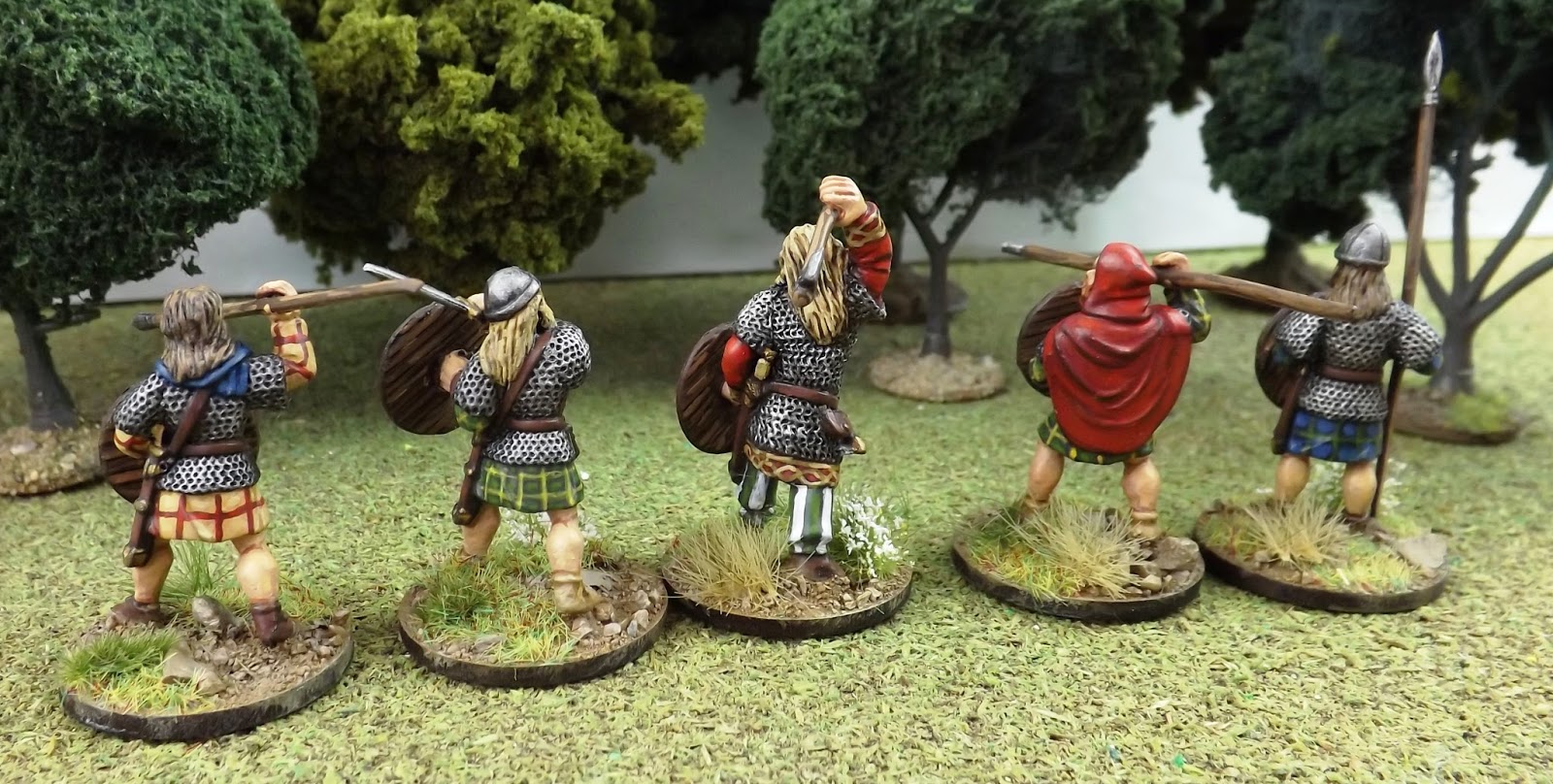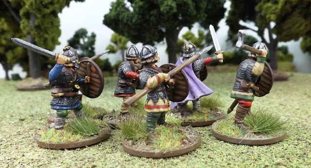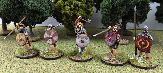 Mr Steve has decided to come at this game from a Gaelic angle and so I thought you might like to see these Scots Theigns and Brodir of Man from the Saga range of figures from Gripping Beast that I have just finished for him.