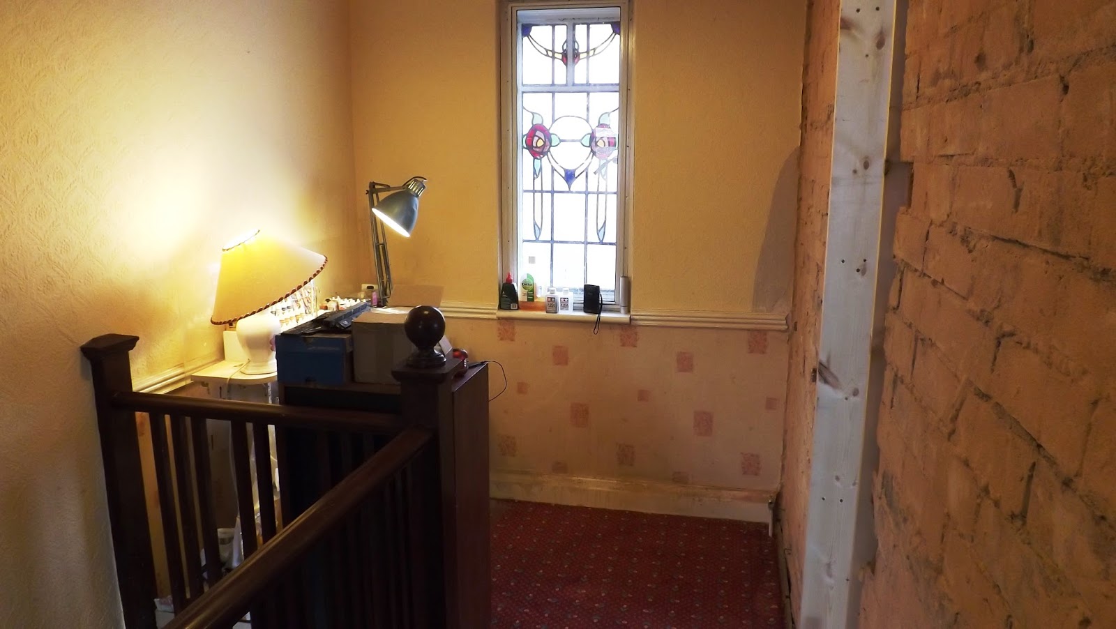 As you can see my little painting desk is very close by and with the first bit of serious knocking the 1930's vintage plaster evaporated into a dusty air choking miasma that covered my desk in plaster remnants.