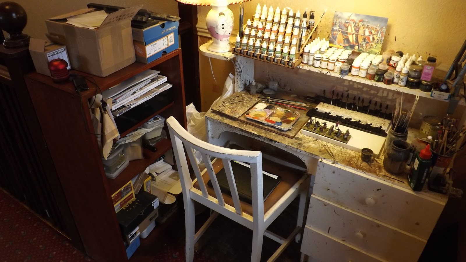 So it seems that every other wargame blog features the painting desk at some time, so here is my little altar to the God of Wargaming all tidied up with everything in its place and minus the plaster and brick debris.