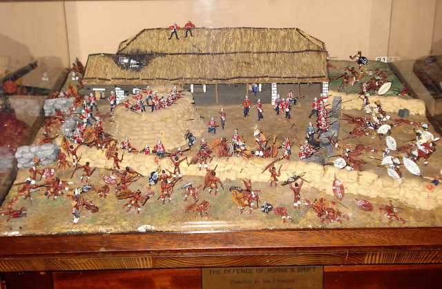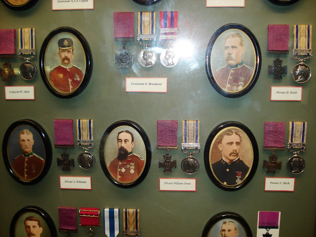 However, there was still on display at the time that I went, especially for the recent visit of King Goodwill, eight of the real Victoria Crosses awarded for Rorkes Drift, there was unfortunately strictly no photography allowed but I recall there being the medals for Privates Hook and Hitch along side Lieutenant Bromhead's. I thought the real medals looked slightly different from what we have come to recognize as a Victoria Cross, a little smaller and lighter in colour. I guess having no medal ribbons in their strong purple made a difference. Still it was an un-expected pleasure to see the real things.