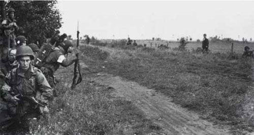 | Men of the 506th PIR, 101st ABD rally on the edge of the Zonche Forest just after landing, being watched by an inquisitive Dutch boy |
