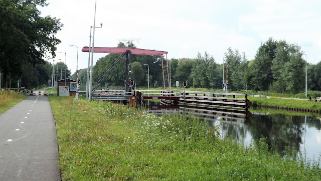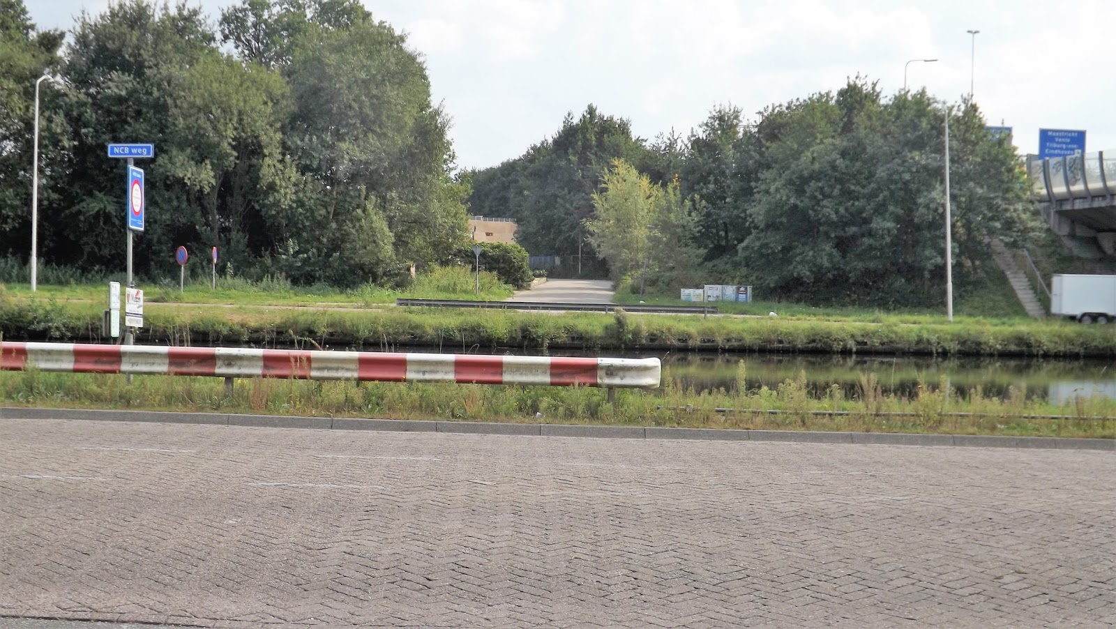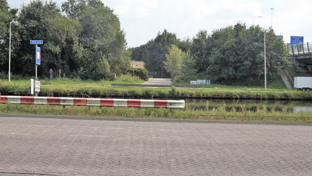 | The old Eindhoven road, opposite, next to the modern motorway bridge, right, where Household Cavalry reconnaissance armoured cars made contact with the American paratroops battling to hold this side of the canal, but were forced to withdraw having confirmed the bridge destroyed by the Germans. |