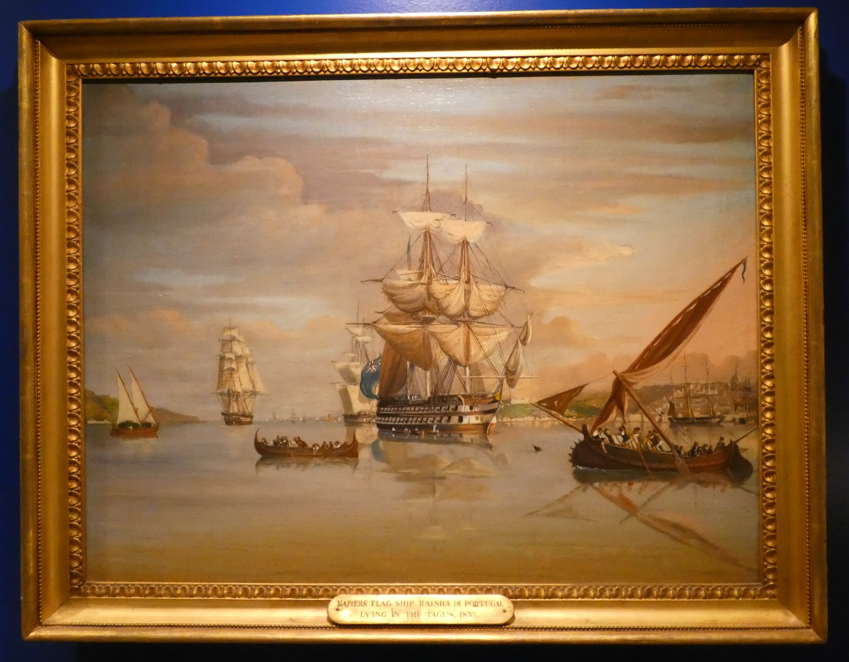 The model below is of the 46-gun frigate Rainha de Portugal (1831-1851), and was formerly British before her sale to the Portuguese Liberals in 1831, and was the flag ship of the Liberal Squadron assembled in the Azores to support the landing at Mindelo Beach near Porto on the 8th July 1832.