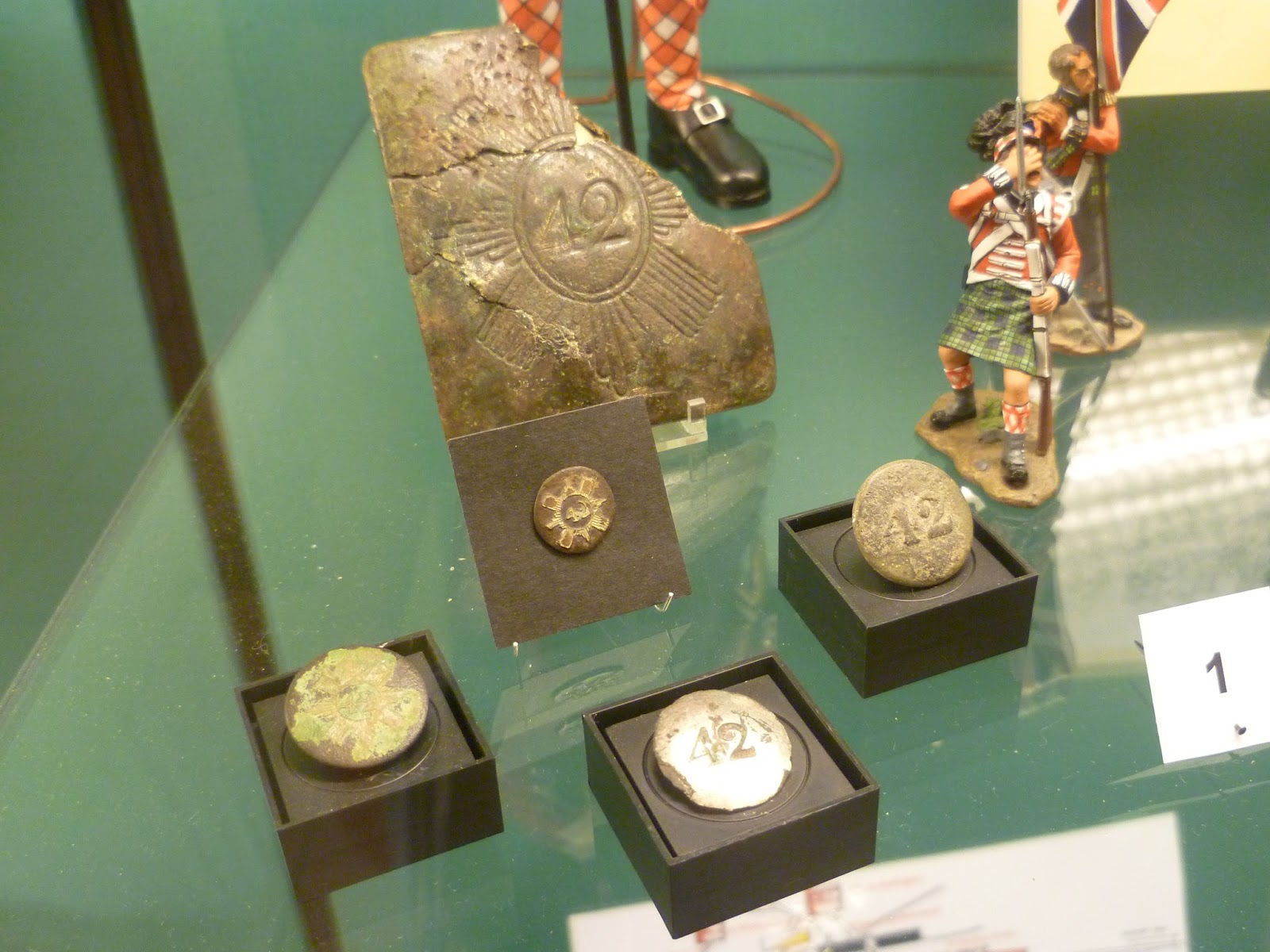 | Relics in the form of buttons and belt plates picked up at Quatre Bras, together with some fine models to illustrate the associated regiments - in this case the 42nd Foot or Black Watch |
