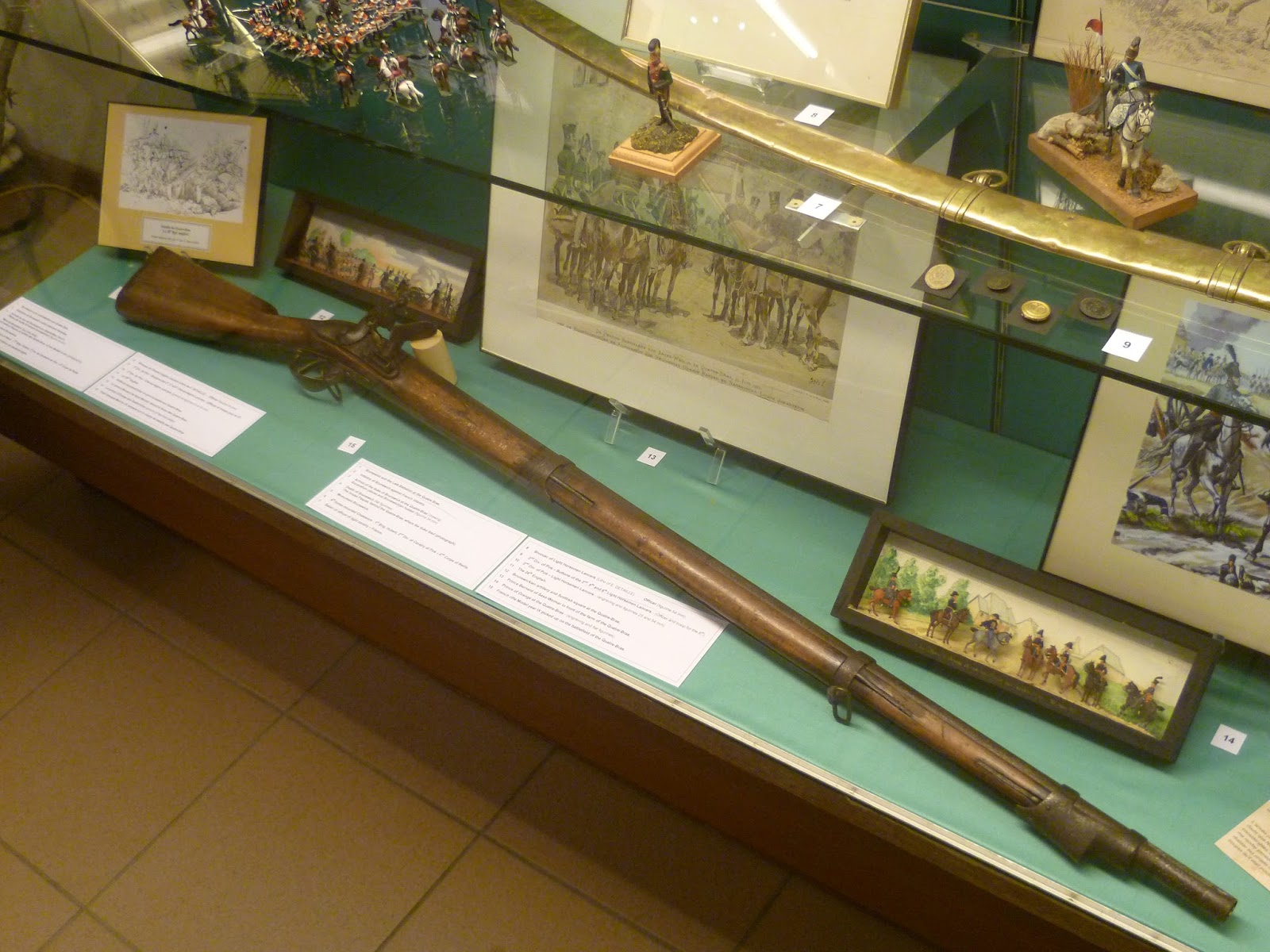 | French musket picked up off the battle of Quatre Bras. Some of the figurines depicting troops from the campaign can be seen on the shelves |