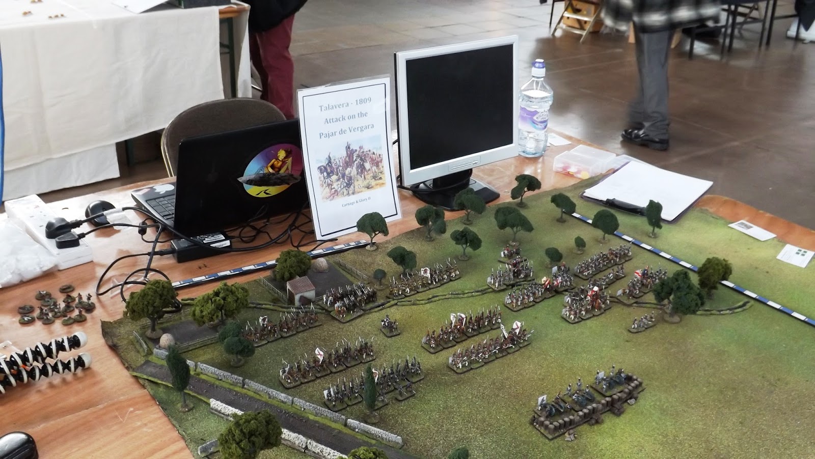 We were very well catered for by the organising team at the show and were able to get the electrics sorted to run the lap top and screen in no time and the following few pictures show the table set up ready to play, with the opposing armies in all their glory.