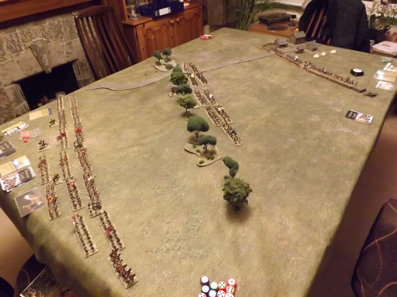 Having thrown some terrain down and arranged our armies we were quickly into the card play and I opted to get their 'fastest with the mostest' by burning my hand of cards bar one in rapid marching, moving my forces up to the road ready to go firm and hold the line.