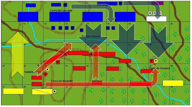 | With two moves (half an hour) of battle the French columns are massing on the Portina stream and before the Pajar as the opposing forces close in the northern valley at the top of the table |